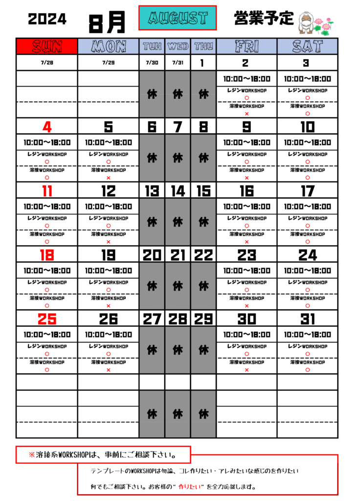 ホーム ワークショップ ウッドレジンアクセサリー作り ウッドレジンコースター作り 溶接系ワークショップ 完全予約制となります。(2週間前のご予約をお願いいたします。) 予約はこちら ワークショップを随時開催しております。 「こんなワークショップできない?」の声も大歓迎です→問い合わせフォーム 溶接ワークショップの詳細 2023年12月4日 ウッドレジンアクセサリー作り【ワークショップ】 2023年12月4日 11月18日㈯19日㈰ウッドレジンアクセサリー作り【ワークショップ】 2023年11月9日 11月26日㈰溶接ワークショップ!キャンプギアを製作しよう! 2023年9月29日 9月23日キャンプギア溶接教室 in DIYガレージ 2023年9月4日 ウッドレジンコースター作り【ワークショップ】 2023年7月25日